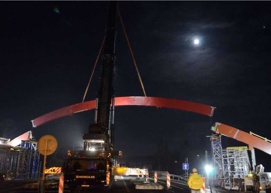 Zamontowano stalowy łuk kładki nad Zakopianką. Fot. GDDKiAźródło: Zamontowano stalowy łuk kładki nad Zakopianką