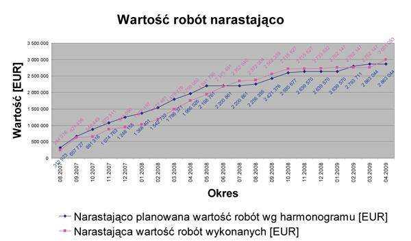 Rys. 1. Miesięczny postęp robót narastająco w zestawieniu z harmonogramemźródło: Sukces - wspólna sprawa