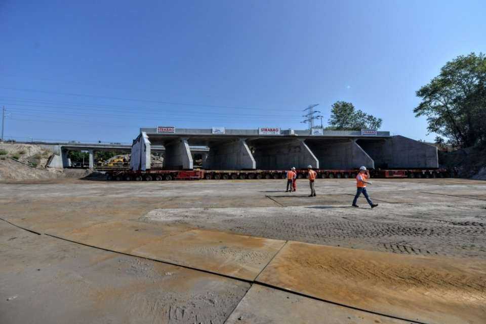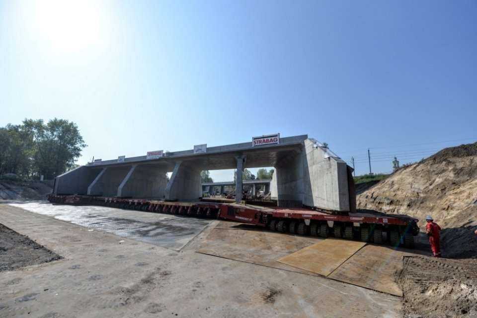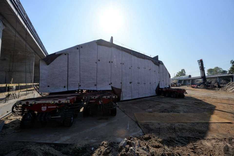 Przewieziono go na specjalnych wózkach z napędem hydraulicznym, które łącznie miały 408 kół. Fot. R. Motylźródło: Tunel Trasy Świętokrzyskiej w nasypie kolejowym