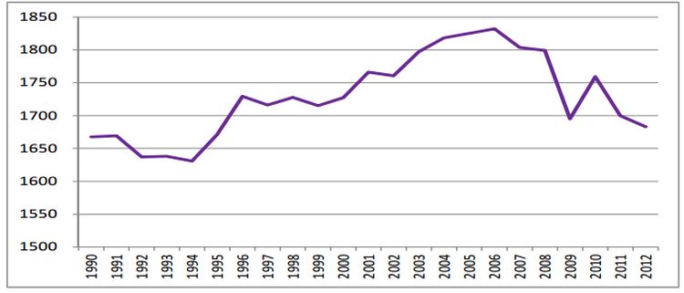Zużycie energii w krajach unijnych w ostatnich dwóch dekadach (w Mtoe). Z archiwum Eurostatu