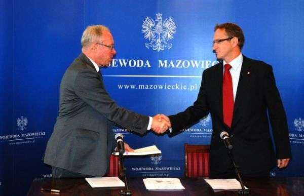 Wojewoda Jacek Kozłowski wręcza zgodę na rozbudowę 2,8 km wału przeciwpowodziowego Wisły. Fot. MUW w Warszawie
