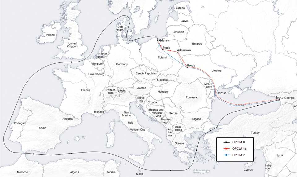 Rozważane warianty trasy dostaw ropy z rejonu Morza Kaspijskiego. Źródło: ILF Consulting Engineers Polska sp. z o.o.
