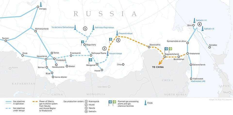 Przebieg budowanego gazociągu Power of Siberia został zaznaczony pomarańczowym kolorem. Fot. Gazprom.