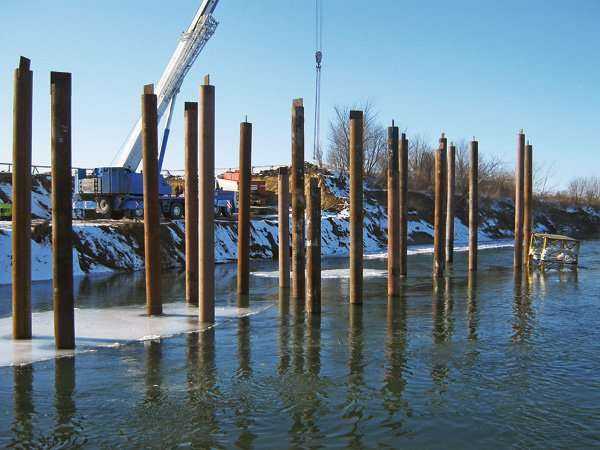 Fot. 1. | Pogrążanie pali stalowych na rz. San pod podpory tymczasowe mostu w ciągu autostrady A4
